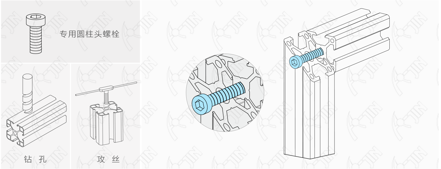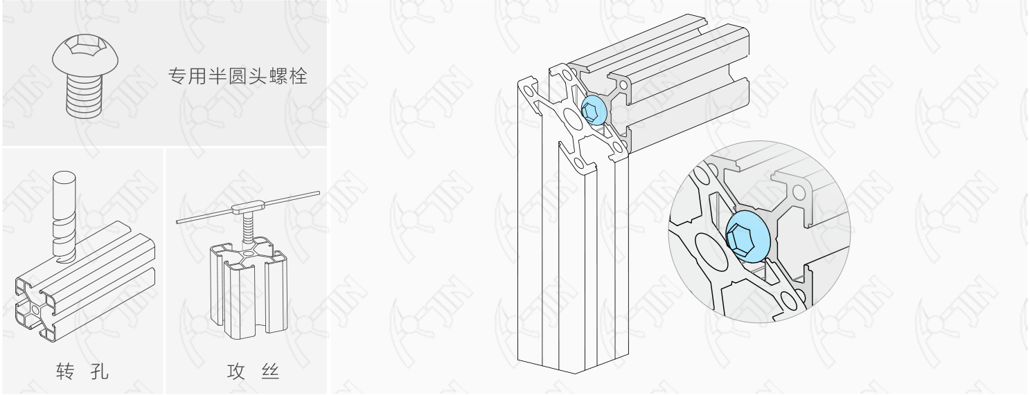 螺母的孔徑或螺栓的直徑需小于或等于型材槽寬