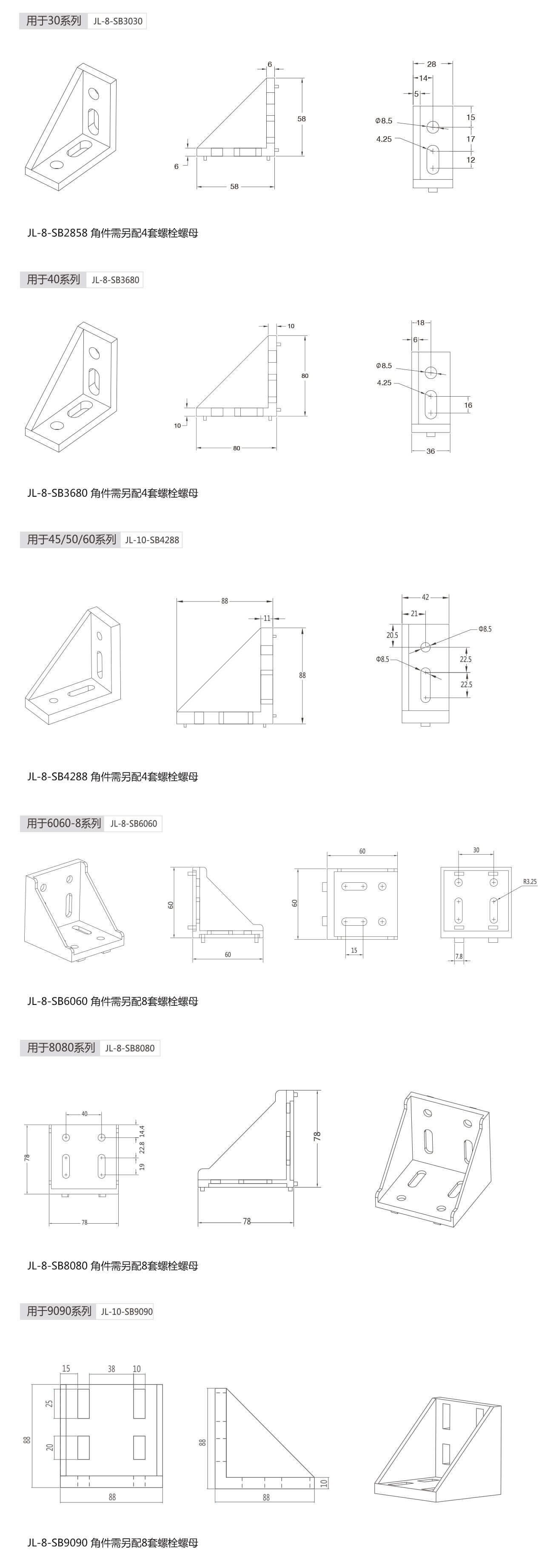 常用于受強(qiáng)力或震動(dòng)的型材與型材連接點(diǎn)的支撐與固定,連接用的T型螺栓及螺母需另配。